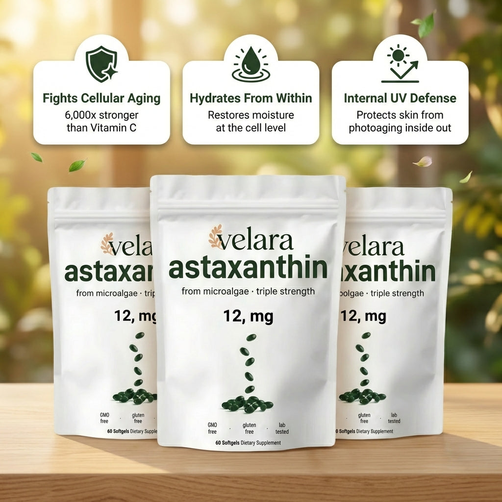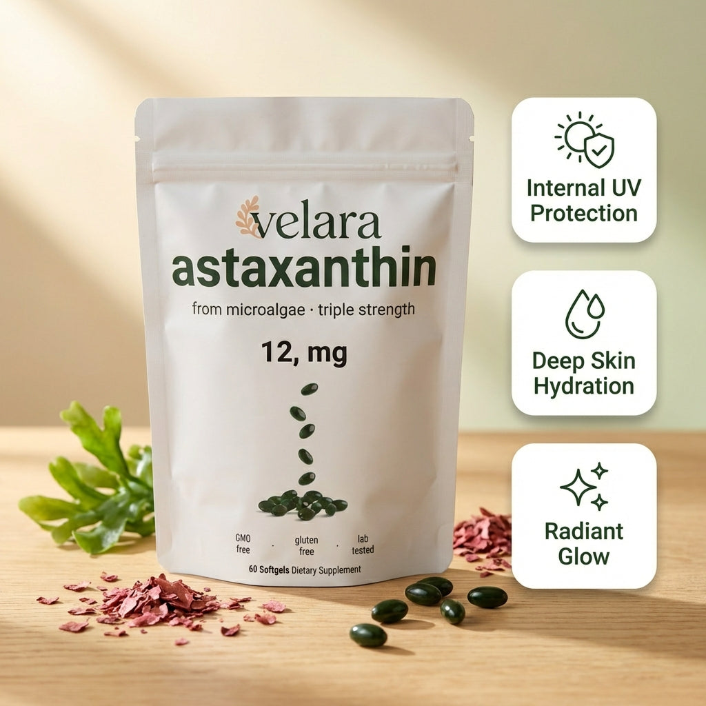 Velara Astaxanthin is a premium daily supplement delivering 12mg of natural astaxanthin sourced from Haematococcus pluvialis microalgae. Designed for women who want radiant, healthy-looking skin from the inside out.