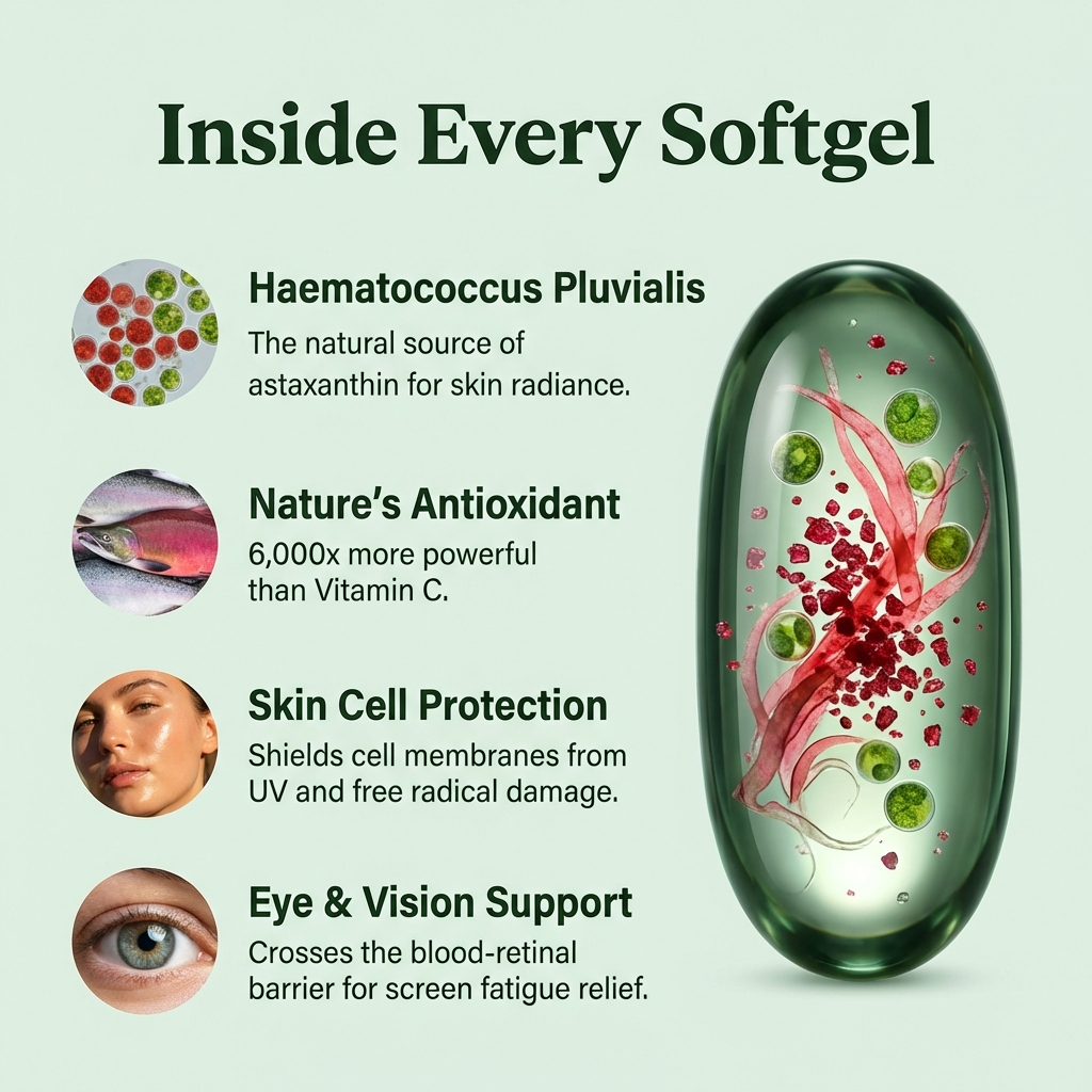 Natural astaxanthin from Haematococcus pluvialis microalgae — 12mg per softgel. The same compound that gives wild salmon and flamingos their pink color.